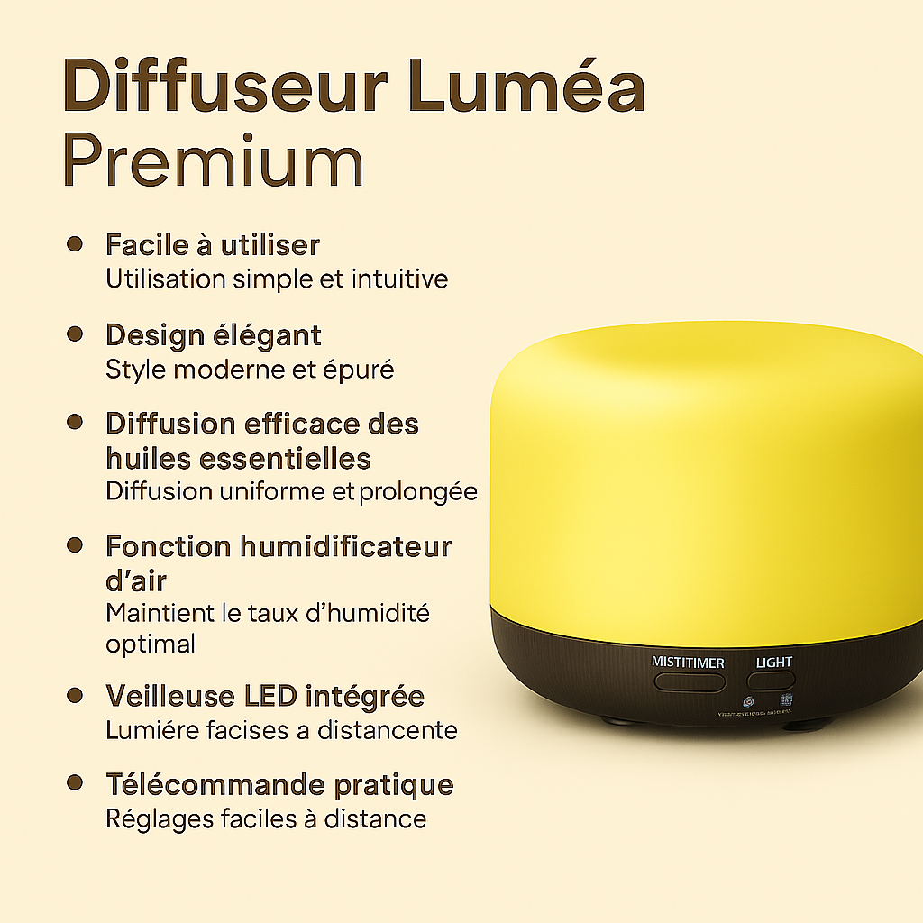 La télécommande pratique du Luméa 500ml Premium vous permet de personnaliser votre expérience aromatique sans bouger de votre confort. Un contrôle absolu pour un bien-être maximal.